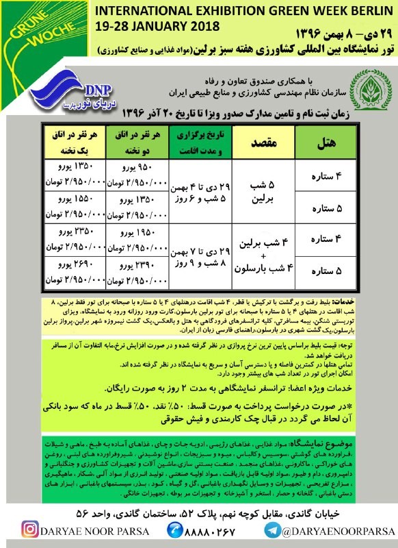 سازمان نظام مهندسی و کشاورزی و منابع طبیعی ایران با همکاری صندوق تعاون و رفاه، تور نمایشگاه بین المللی کشاورزی هفته سبز برلین برگزار می کند. جهت ثبت نام و تامین مدارک صدور ویزا تا تاریخ 20 آذر 96 فرصت دارید.