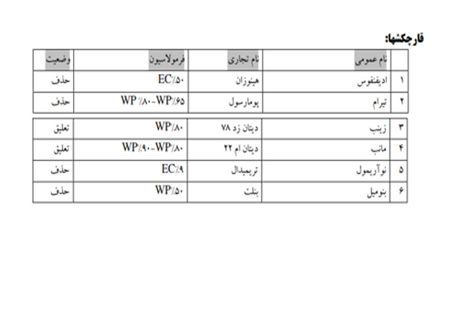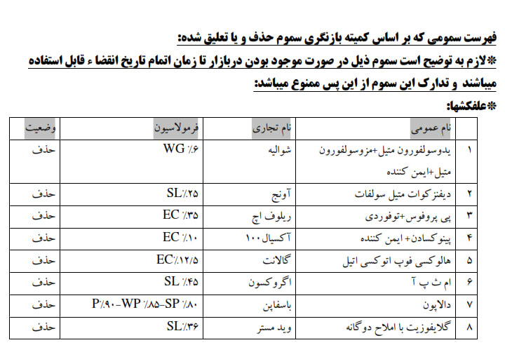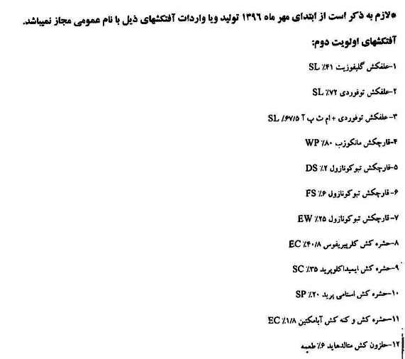 در این اطلاعیه لیست تولید و یا واردات آفتکش هایی که از ابتدای سال 96 با نام عمومی مجاز نمی باشند ذکر شده است و به ترتیب اولویت اول و اولویت دوم نام گذاری شده اند.